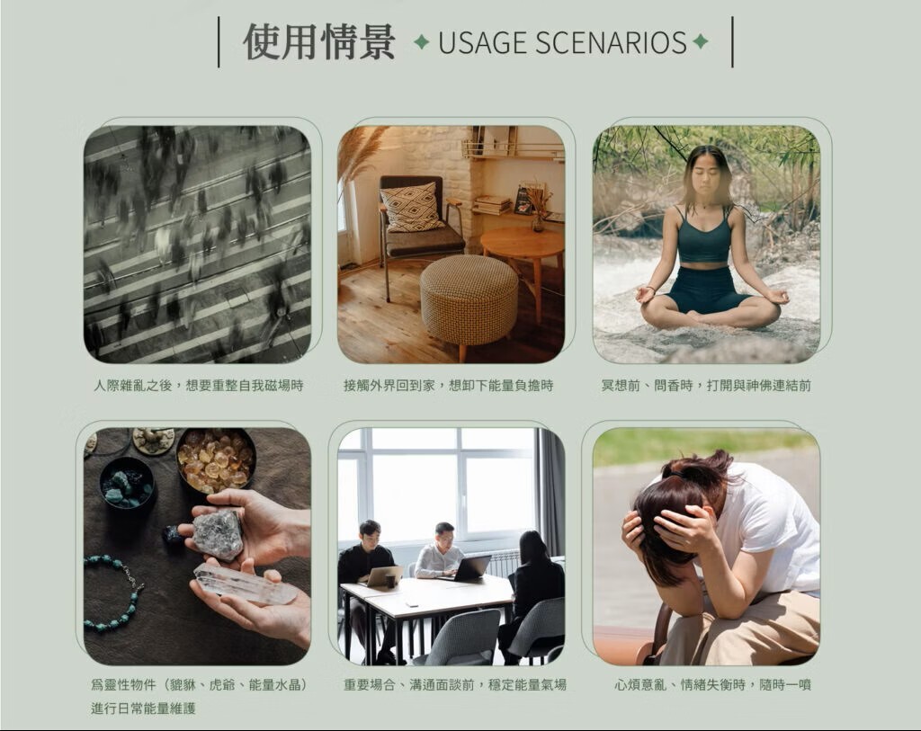 Alice 強調這不只是單純的空間淨化,更是針對我們身心靈的深層淨化。就像在打坐前,會先噴一下讓心安定;或者當我們覺得煩躁、跟客戶發生糾紛,甚至剛被老闆罵完的時候,也很適合用。這就像是一個 reset 或 refresh 的按鈕,能把雜亂的心重新調回清淨的狀態