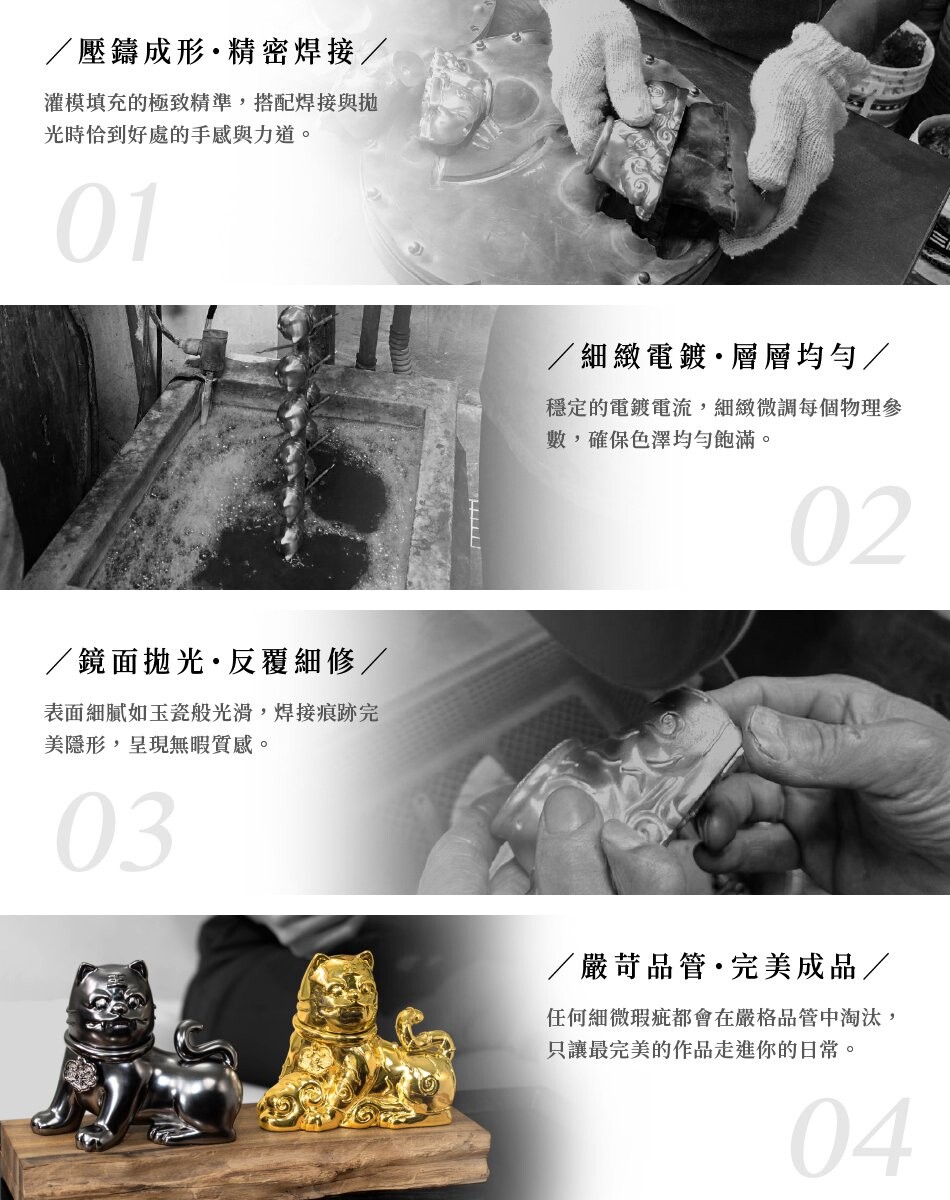 以錫合金鑄造,由台灣老師傅以數十年工藝淬鍊。歷經壓鑄、精密焊接、反覆電鍍與鏡面拋光,確保表面細膩光滑、無痕如玉,任何瑕疵皆在嚴苛品管中淘汰,只為為每一尊【虎曜緣神HOYYA虎爺】披上尊貴華美的鎧甲。